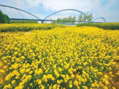 济南:黄河大桥下 油菜花绽放
