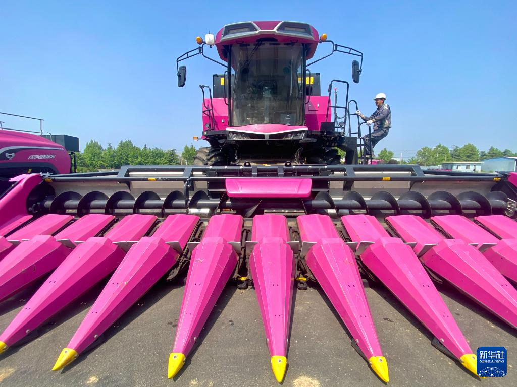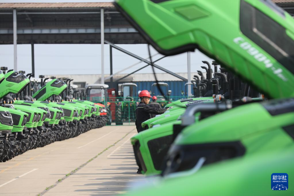 4月26日,在山东省临沂市临沭县一家农业机械制造企业,工人在堆场查验出口机械。
