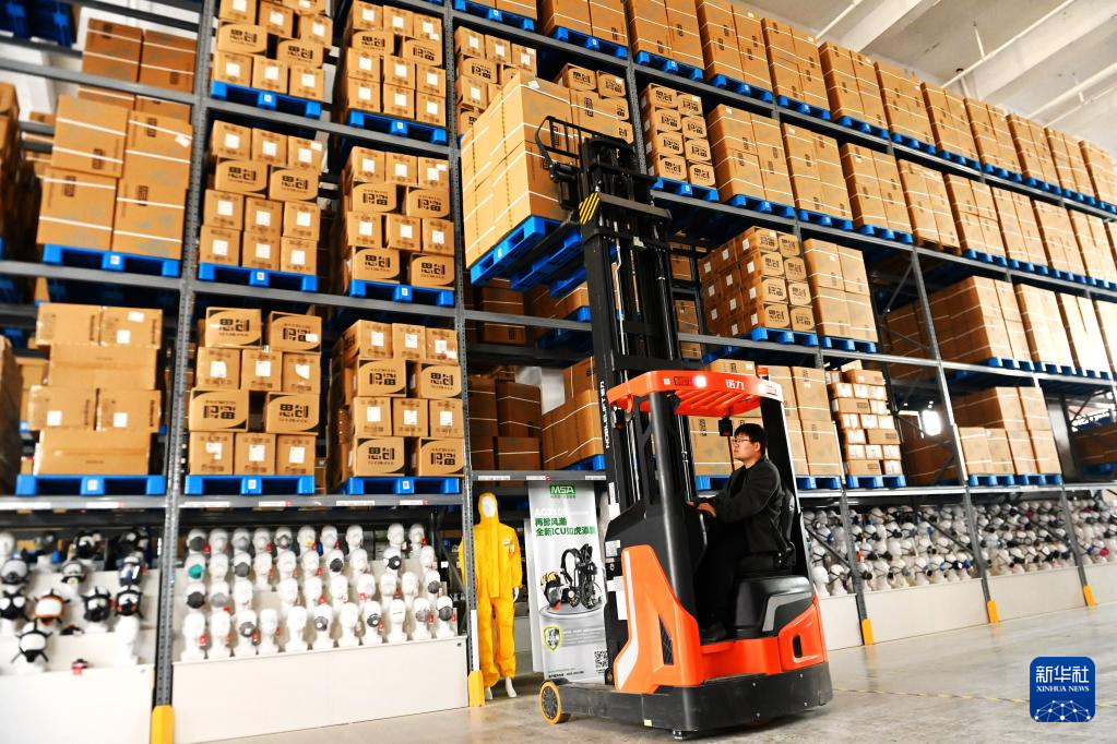 4月26日,在山东省临沂市兰山区一家科技有限公司,一名员工在物流园内整理货物。