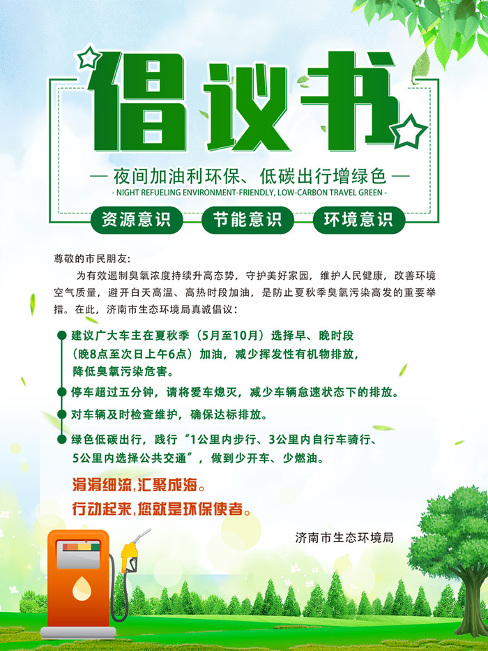 同时,倡议绿色低碳出行,践行“1公里内步行、3公里内自行车骑行、5公里内选择公共交通”,做到少开车、少燃油。目前,济南有460余家加油站积极践行环保理念,推出夜间加油优惠措施,争当环保使者。