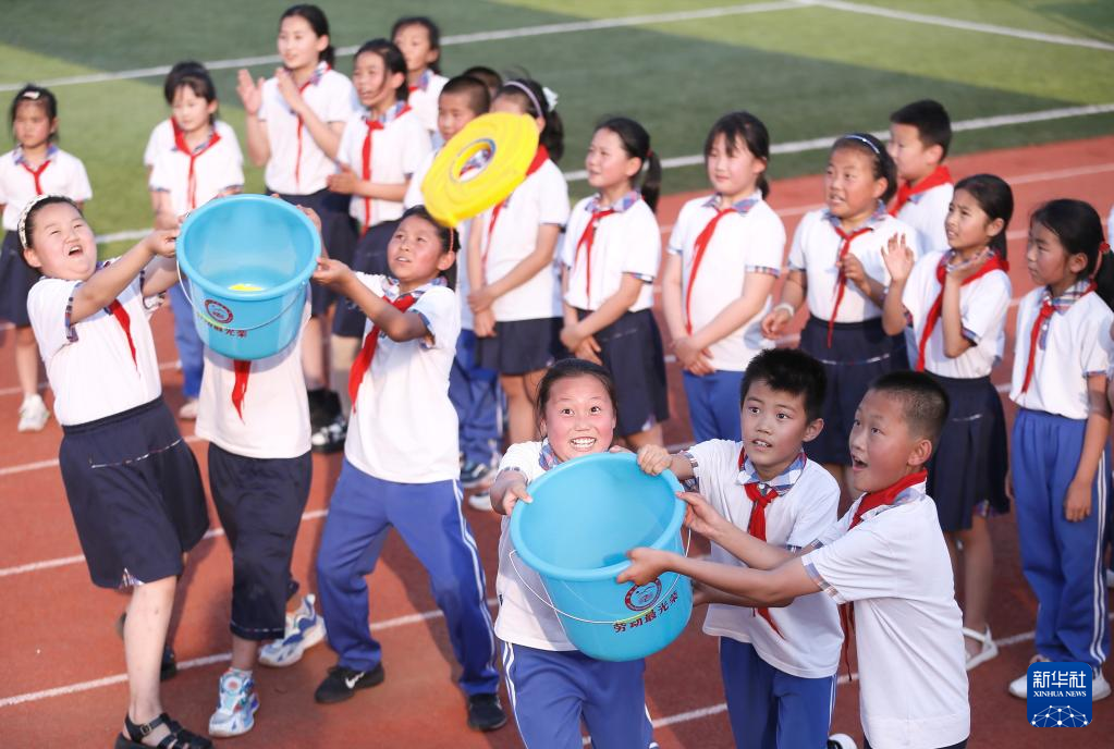 6月7日,山东省青岛市即墨区鳌山卫方正小学的学生在进行“精准接物”比赛。新华社发(梁孝鹏 摄)