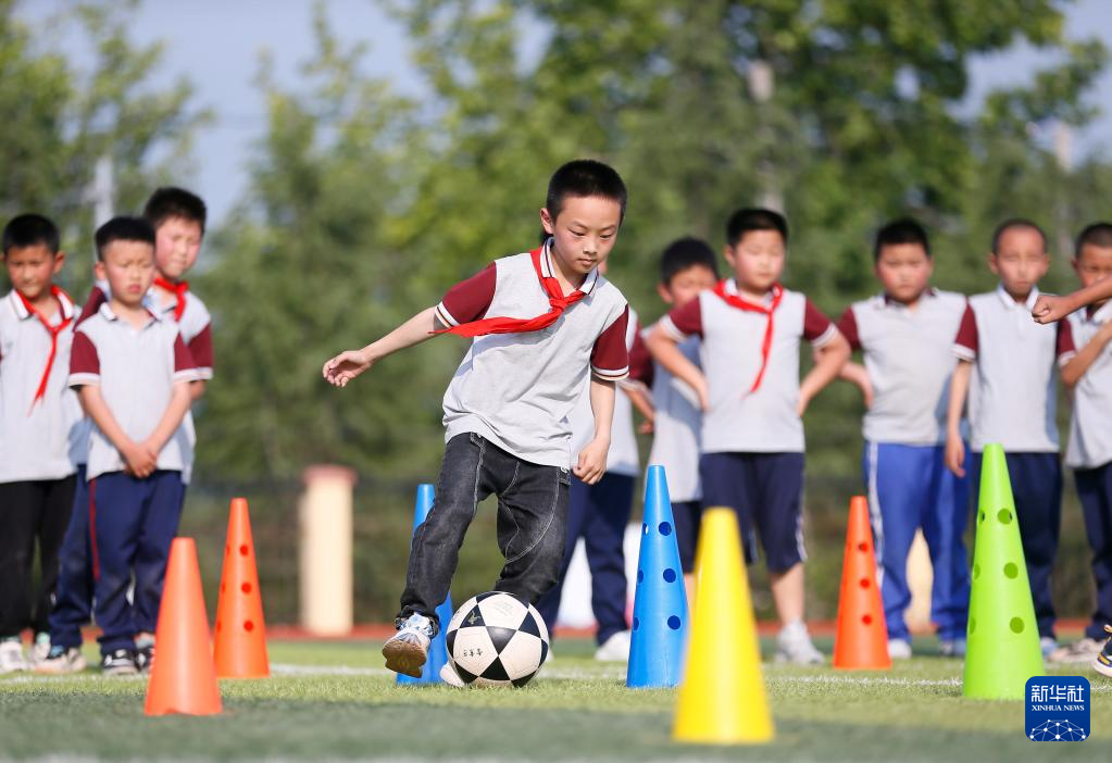 6月7日,山东省青岛市即墨区鳌山卫方正小学的学生在进行“运球绕桩”比赛。新华社发(梁孝鹏 摄)