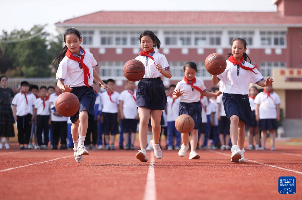6月7日,山东省青岛市即墨区鳌山卫方正小学的学生在进行“欢乐拍球”比赛。新华社发(梁孝鹏 摄)