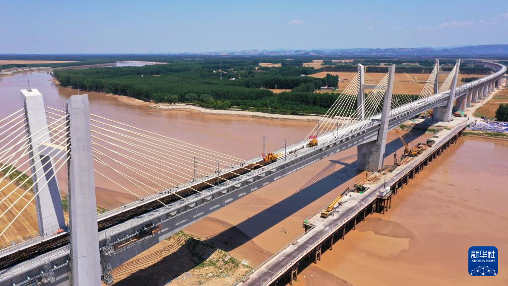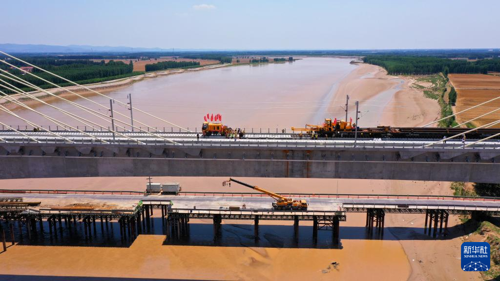 6月14日,在济郑高铁山东段长清黄河特大桥,中铁十局的工作人员进行铁轨铺设作业(无人机照片)。新华社记者 郭绪雷 摄