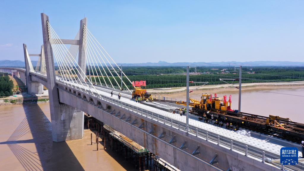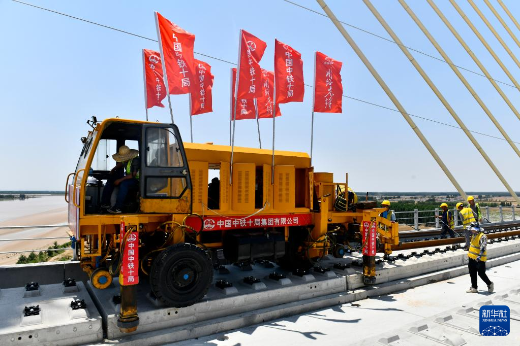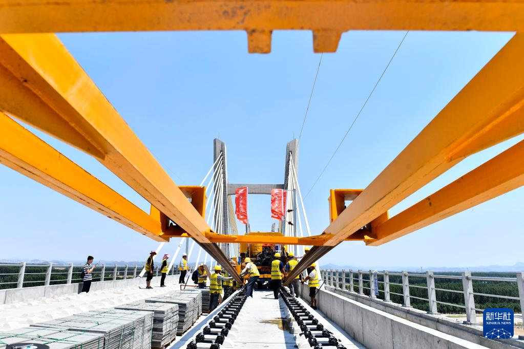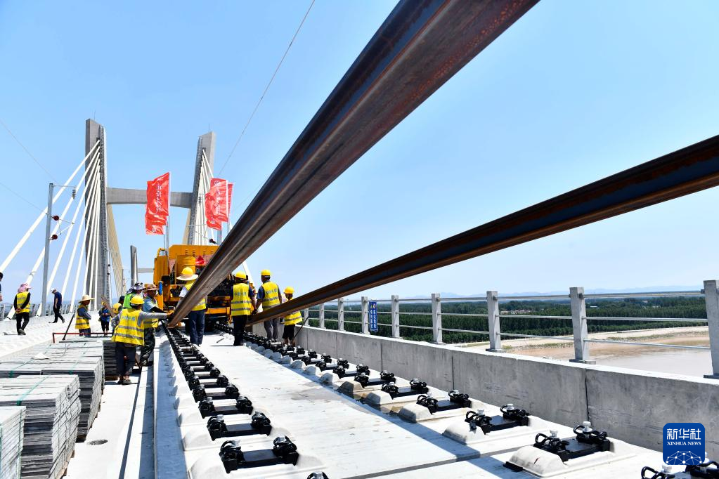 6月14日,在济郑高铁山东段长清黄河特大桥,中铁十局的工作人员进行铁轨铺设作业。新华社记者 郭绪雷 摄