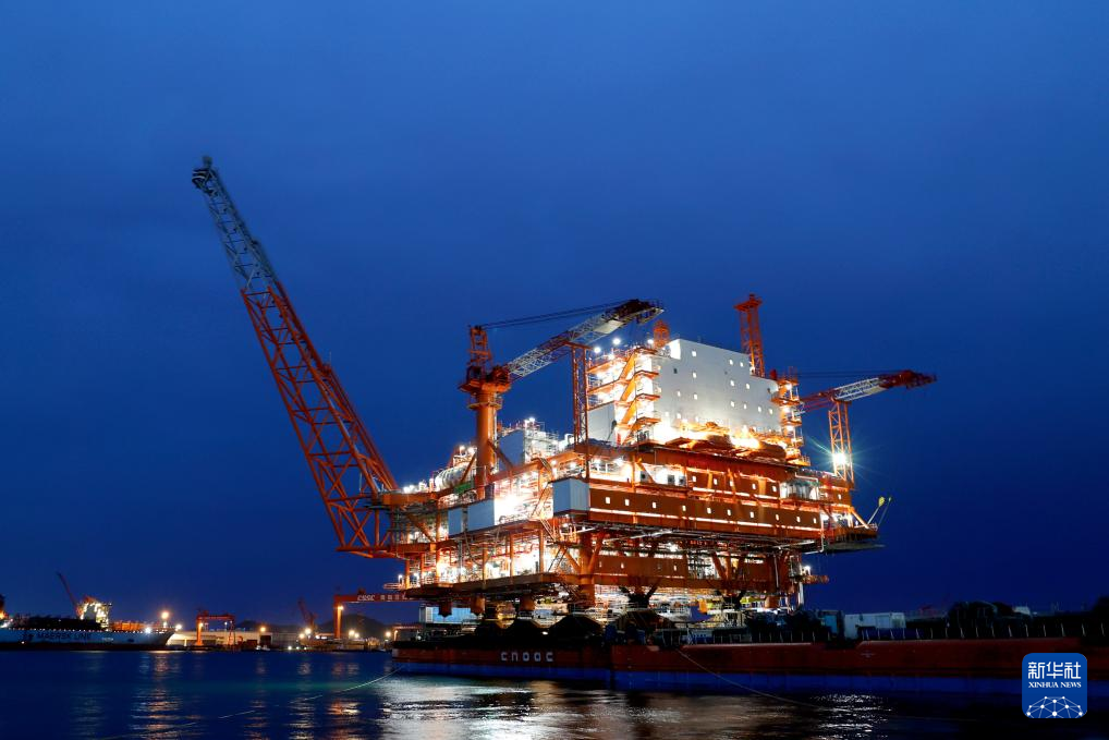 这是7月10日在山东省青岛市拍摄的完成装船后的渤中19-6凝析气田一期项目中心平台夜景。新华社发(杜鹏辉 摄)