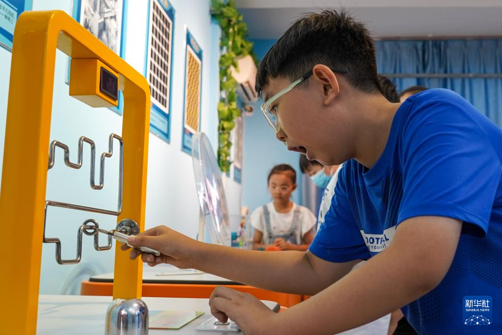 7月19日,在无棣县棣丰街道星湖社区服务中心,孩子们体验科学游戏。