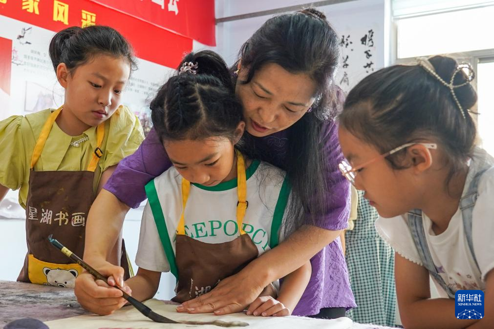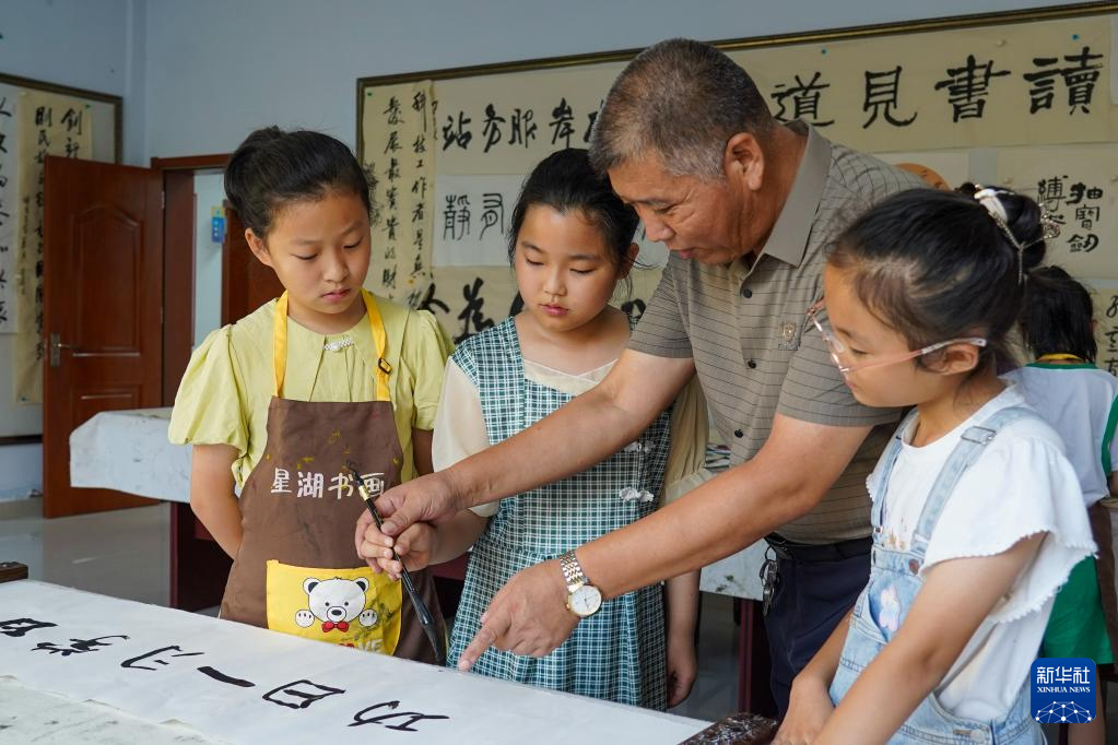 7月19日,在无棣县棣丰街道星湖社区服务中心,志愿者教孩子们写毛笔字。