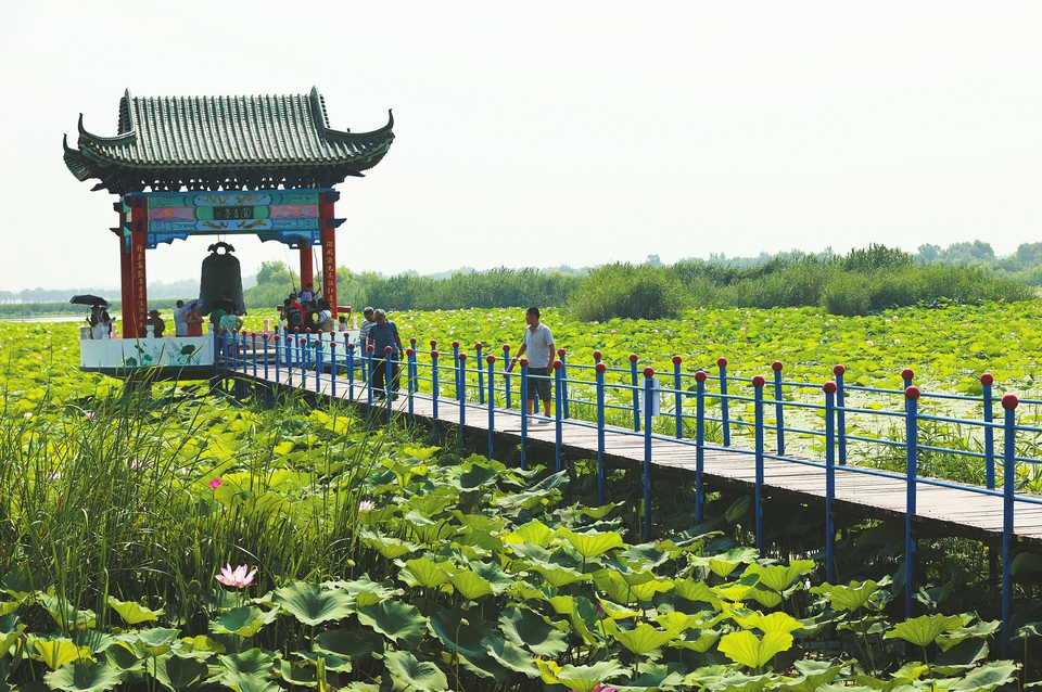 盛夏时节,济南白云湖湿地尽显自然之美,水生植物错落栽植,更有鸟雀争鸣,野鸭横渡,动静皆宜。万亩荷花正次第开放,给炎热的夏天带来缕缕清香。青翠欲滴的荷叶与红白相间的荷花交相辉映,呈现出“接天莲叶无穷碧,映日荷花别样红”的秀美景色,吸引了游客们慕名而来。