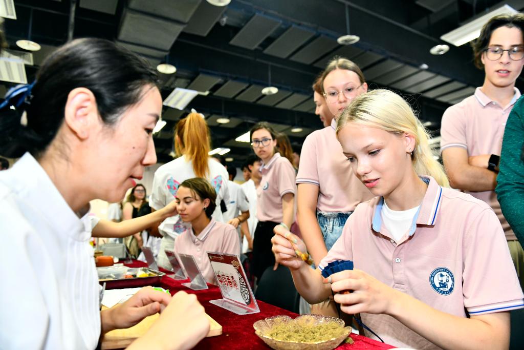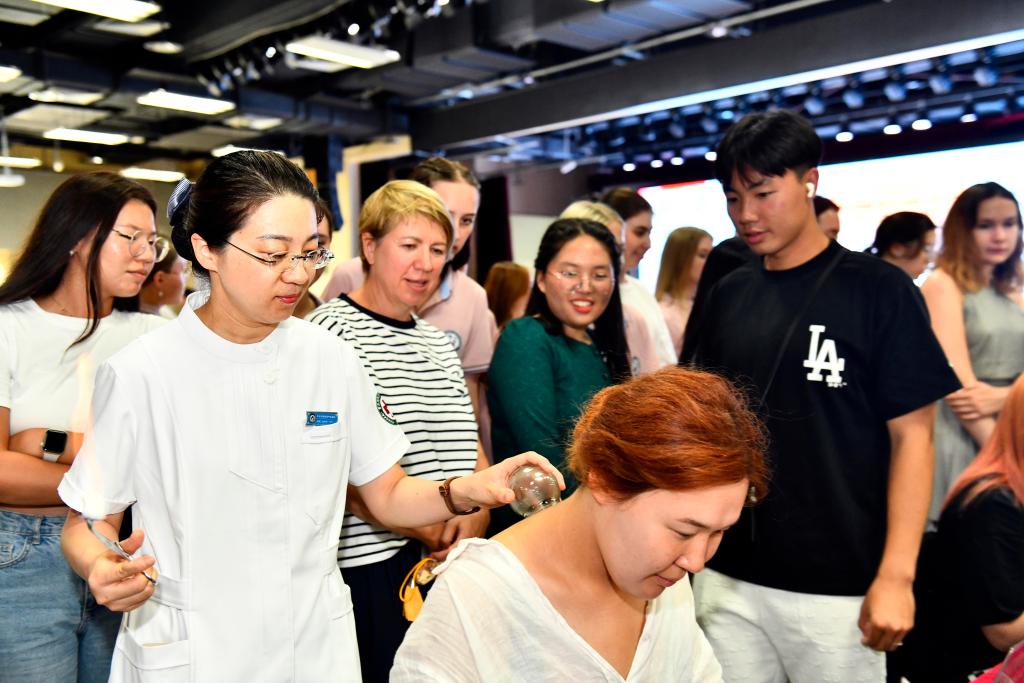 山东省青岛市黄岛区卫健部门依托辖区中医药诊疗资源,与中国石油大学(华东)合作,在国际教育学院设立沉浸式中医药文化体验中心,定期安排中医医护人员为留学生开展中医诊疗、中医茶饮、拔罐、刮痧、八段锦、耳穴压豆等特色中医药诊疗服务,让留学生体会中医药文化的魅力。新华社记者 李紫恒 摄