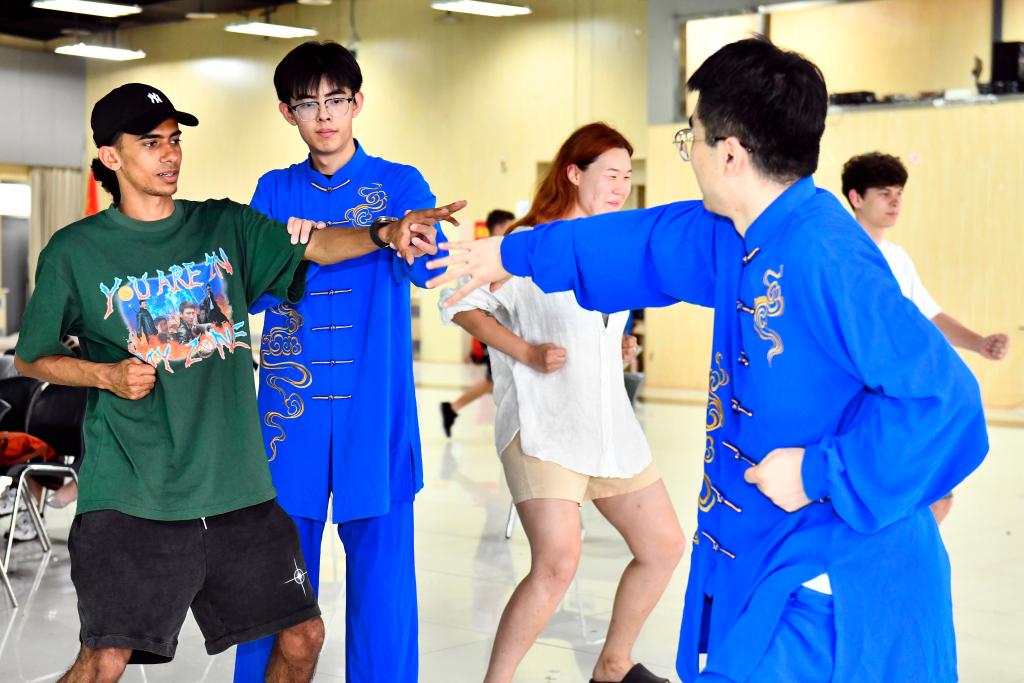 7月20日,在中国石油大学(华东)沉浸式中医药文化体验中心,黄岛区中医医院的医护人员教留学生学习八段锦。