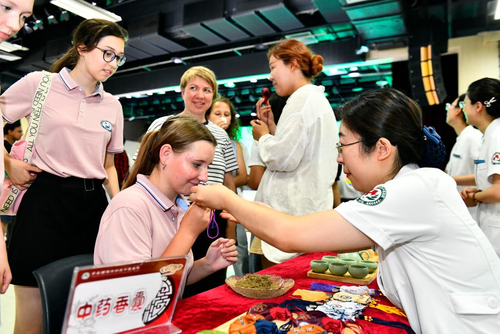 7月20日,在中国石油大学(华东)沉浸式中医药文化体验中心,黄岛区中医医院的医护人员为留学生倒上中药茶饮。