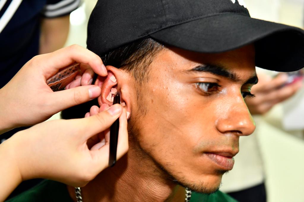 7月20日,在中国石油大学(华东)沉浸式中医药文化体验中心,留学生在体验耳穴压豆中医疗法。