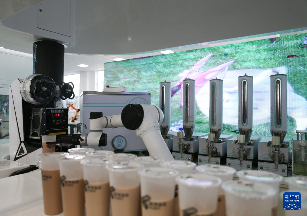 7月25日,在位于淄博市临淄区的遨博(山东)智能机器人有限公司,机器人在制作奶茶。