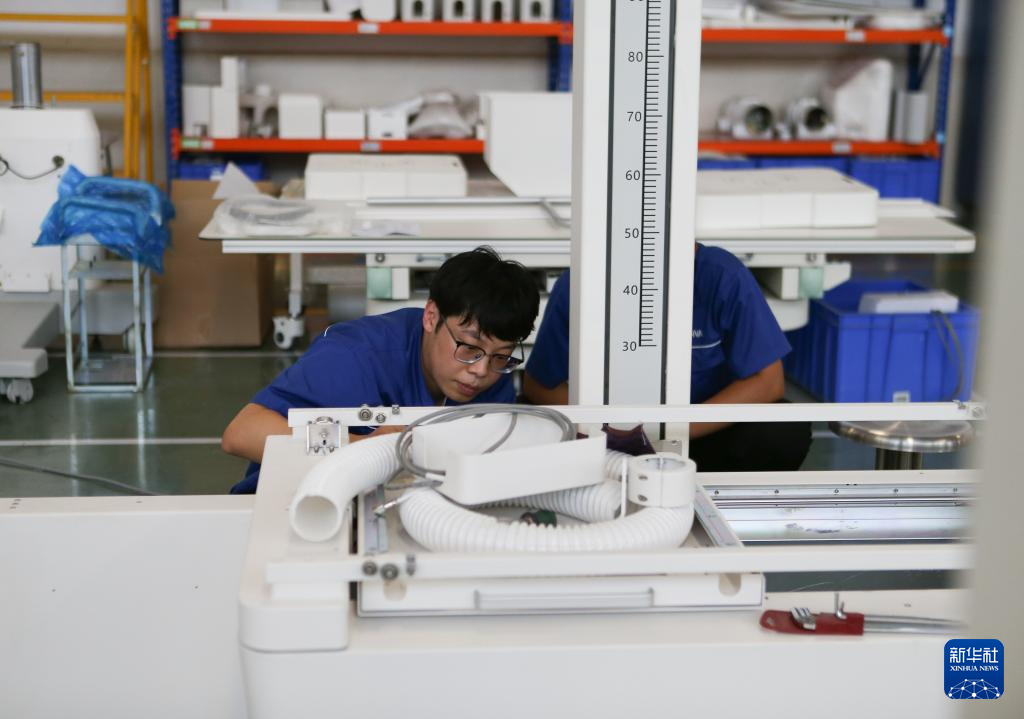 7月25日,在位于淄博市高新区的山东新华医疗器械股份有限公司,工作人员在车间组装医疗设备。