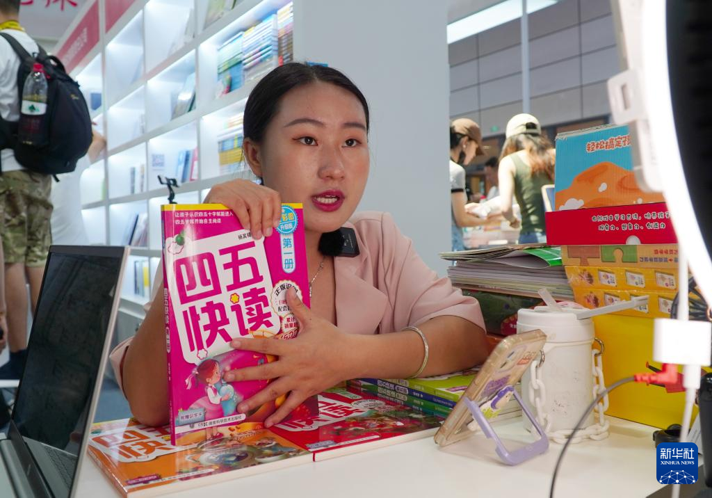 7月27日,在第31届全国图书交易博览会上,一名出版社的工作人员在进行网络直播销售图书。新华社记者 徐速绘 摄