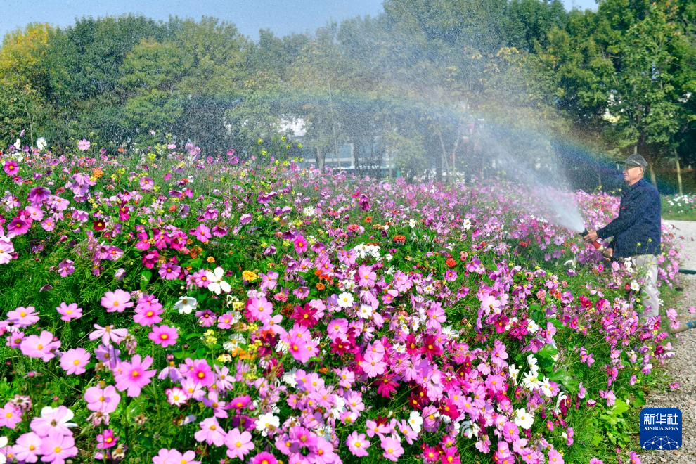 10月25日,工作人员在养护日照市东港区碳汇花海。