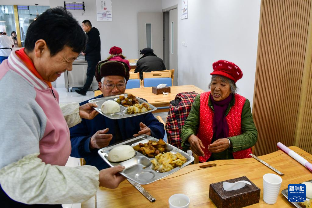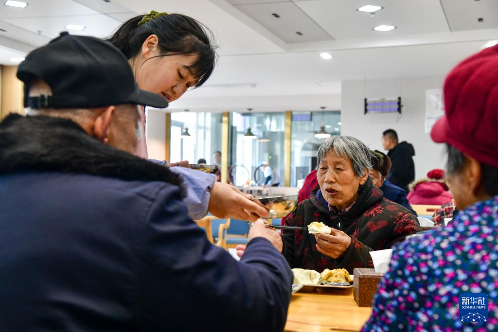 1月29日,工作人员在济南市长清区马山镇综合养老服务中心餐厅为老人服务。新华社记者 朱峥 摄