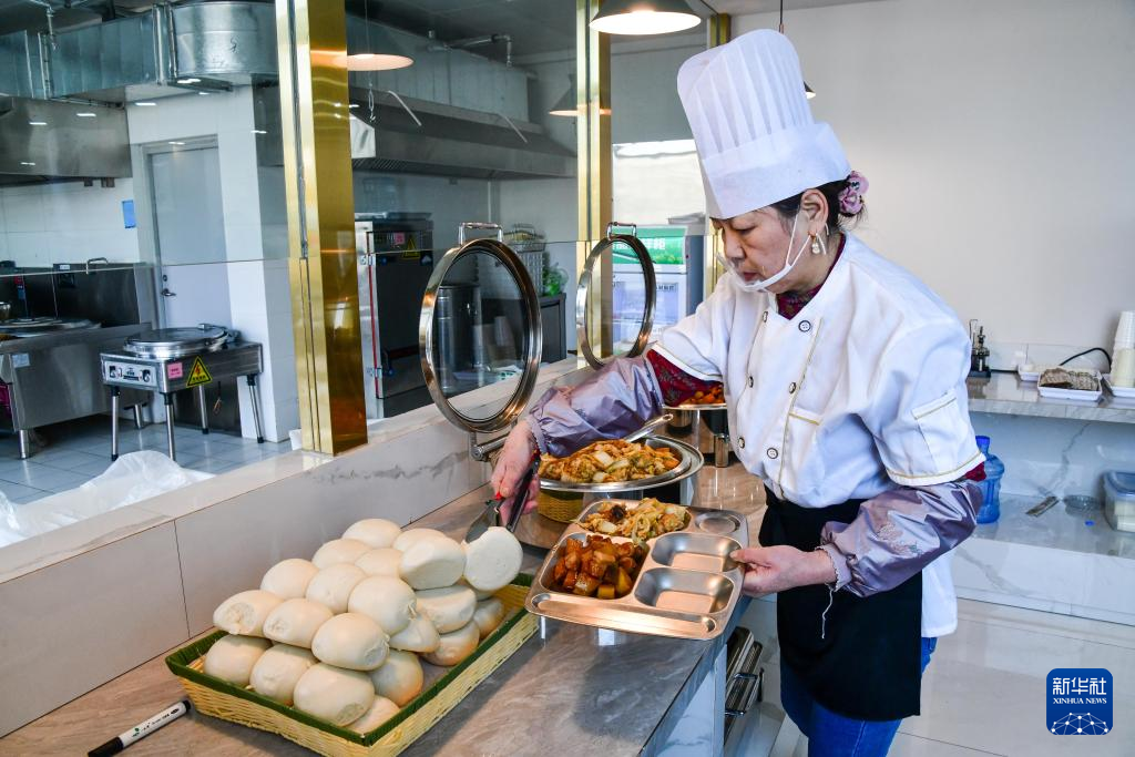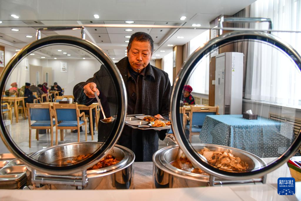 1月29日,一位老人在济南市长清区马山镇综合养老服务中心餐厅盛菜。新华社记者 朱峥 摄