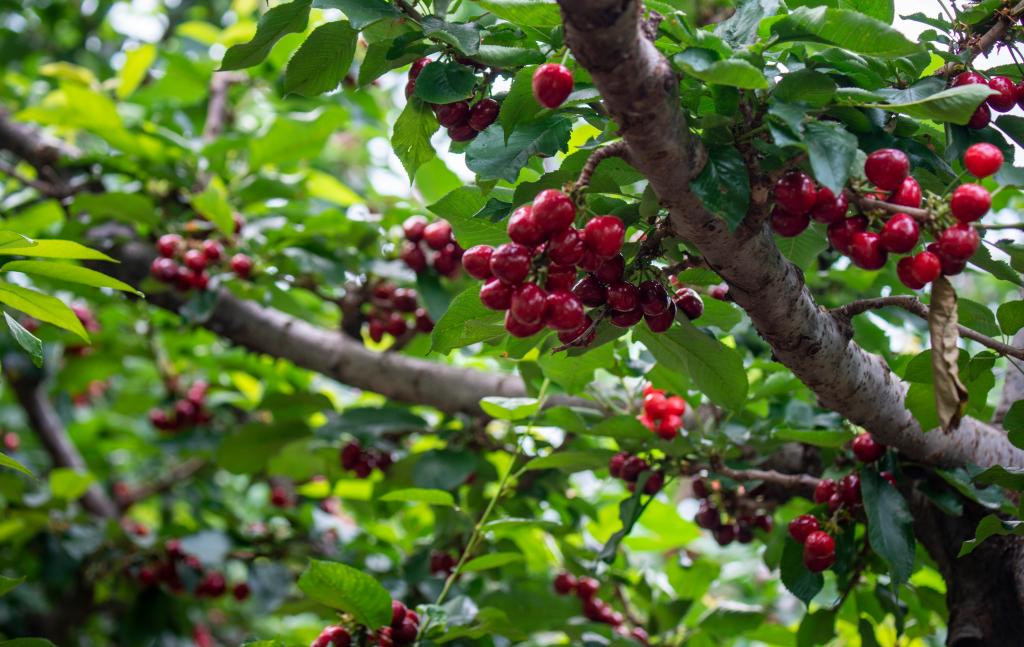 大樱桃树还吃上了“精细粮”。于江源说,为了改良土壤,合作社购买了散养羊的羊粪作为有机肥,同时施用自制沼液。有了多种农业科技手段的加持,温室大棚的“温度优势”成为大樱桃生长的“产量优势”,从而转化为实实在在的经济效益。目前,弘基山庄大樱桃基地已建成5个温室大棚,主要种植“美早”“俄八”“佳红”等5个品种,今年的产量预计突破3万斤,实现全年都有新鲜大樱桃上市。