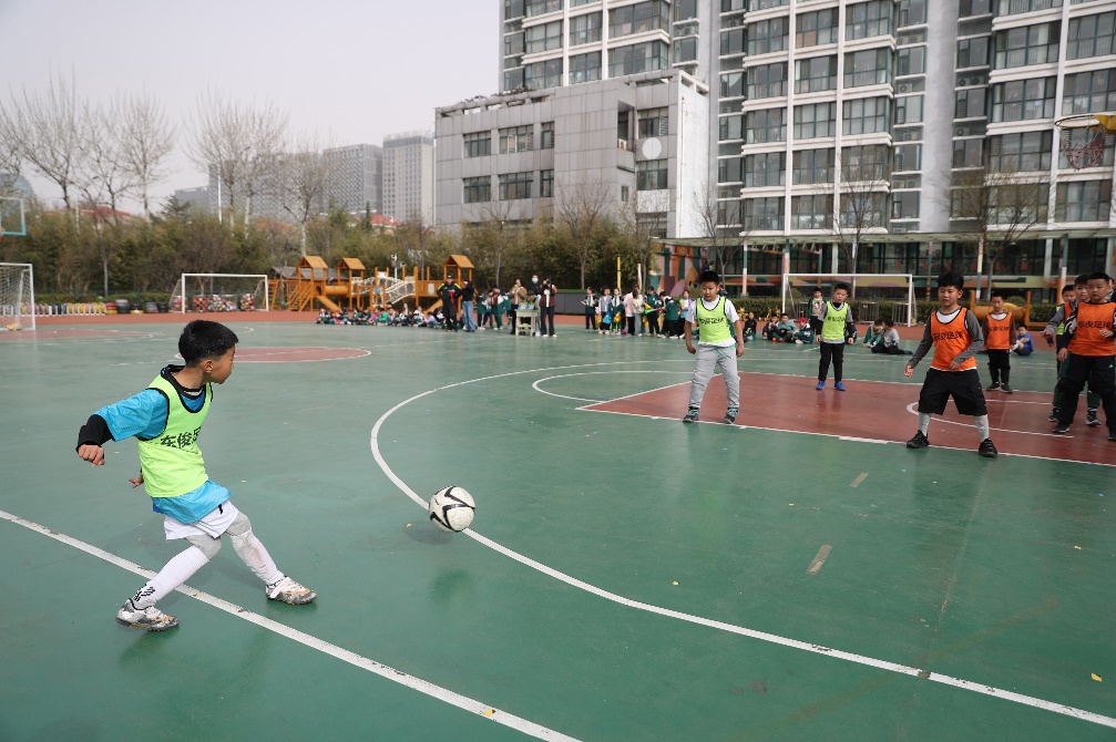 上午第一节课,潍坊高新双语学校的操场上便热闹非凡,学生们在老师的指导下,正激烈地进行着一场足球比赛。赛场上,选手们奋力拼搏;赛场下,学生们摇旗呐喊,场面十分热烈。