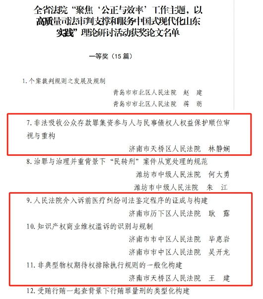 除上图中的一等奖之外,济南中院审管办曹磊撰写的《入库案例遴选标准要素式阐述》获全省二等奖。济南中院研究室易志鑫撰写的《网络暴力犯罪刑事程序法治理的探索与补充》,天桥法院庄丽梅撰写的《醉驾型危险驾驶罪犯罪附随后果治理的路径探索》获得全省三等奖。