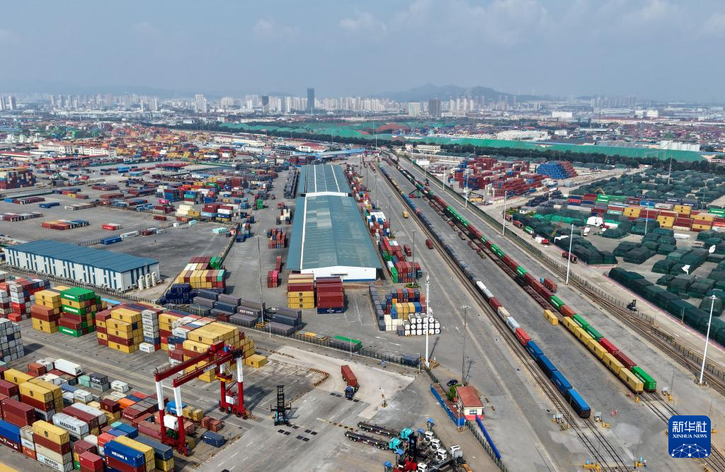 这是8月19日拍摄的山东港口青岛港前湾港区海铁联运中心堆场(无人机照片)。