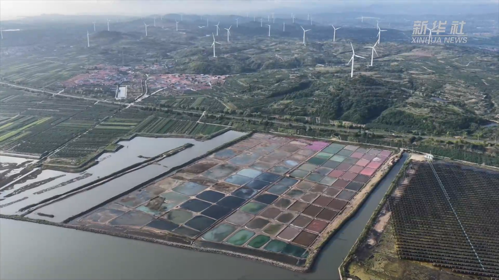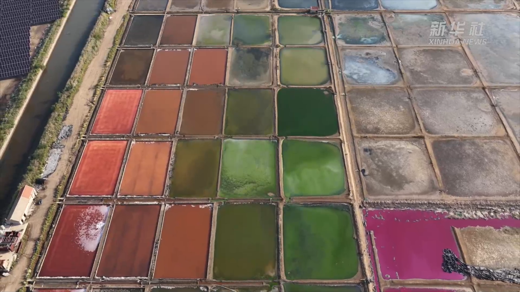 近日,山东省荣成市好运角旅游度假区内一处盐田呈现出粉、绿、紫、蓝等色彩,宛如一个巨大的调色板镶嵌于大地之上。