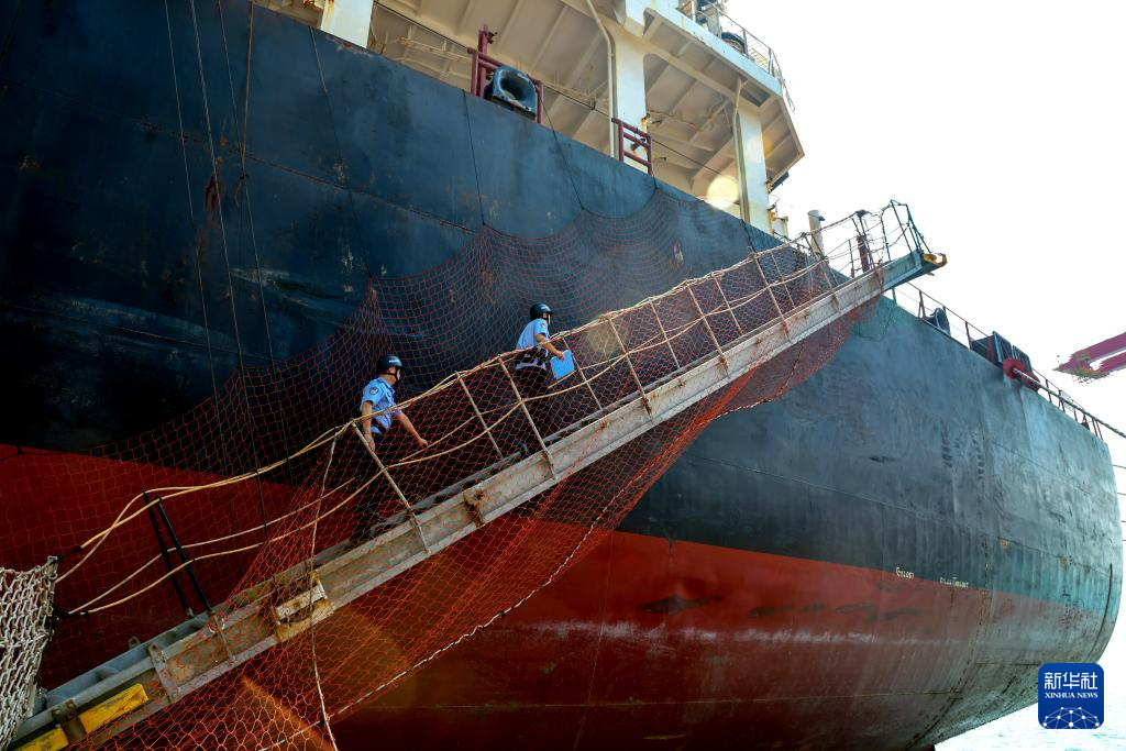 10月1日,山东日照出入境边防检查站的民警坚守一线,通过人工巡查、登轮检查等,维护国际船舶在港安全,保障口岸出入境通关高效畅通。新华社记者 郭绪雷 摄