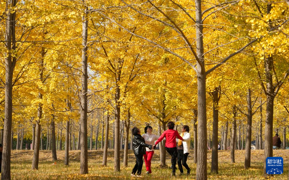 10月29日,人们在济南市槐荫区的一片银杏林里游览。新华社记者 徐速绘 摄