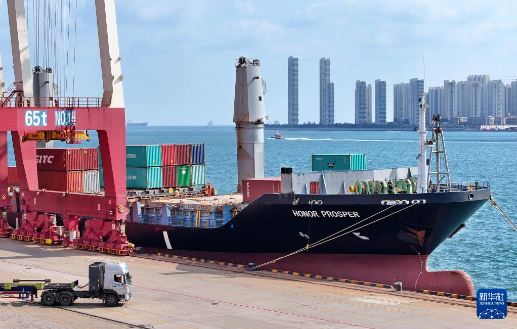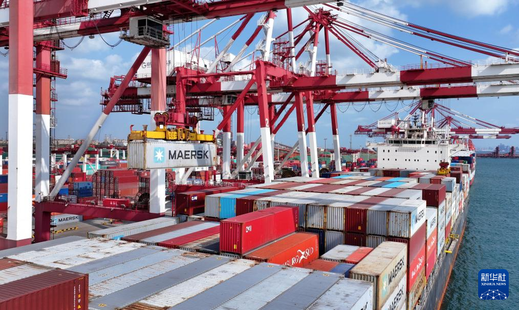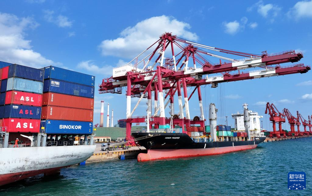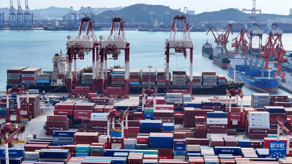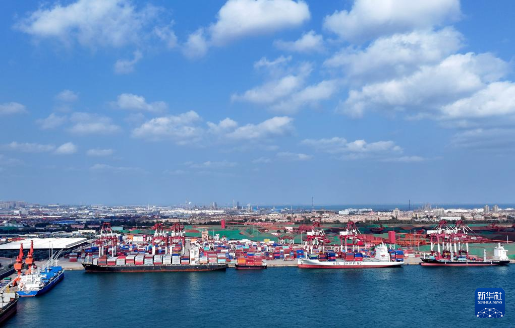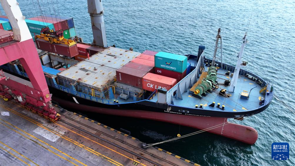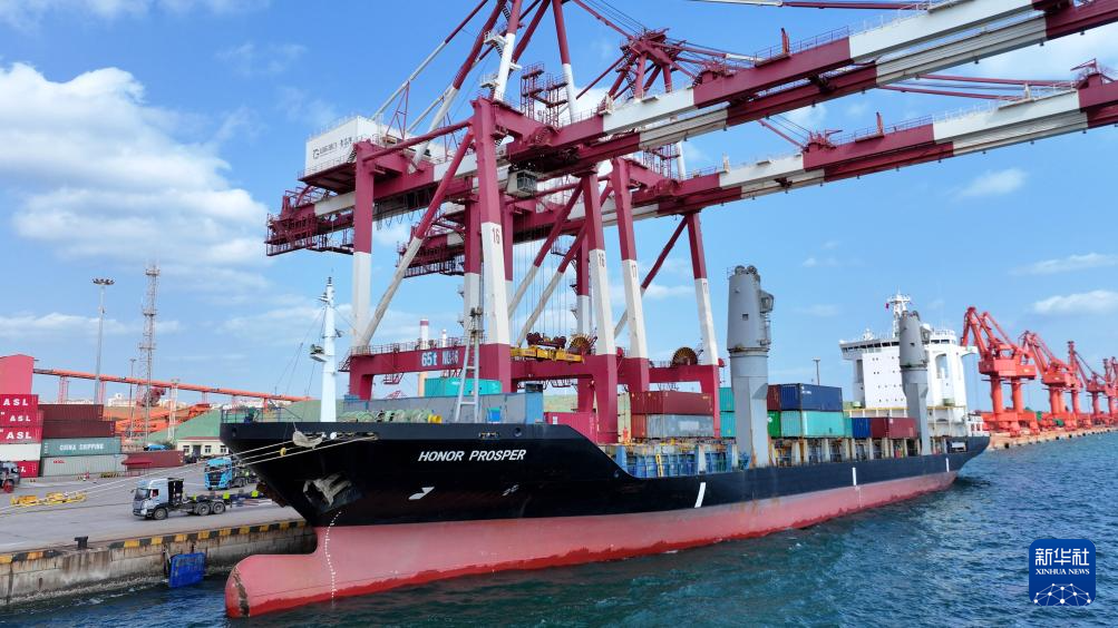 一艘直达韩国仁川港的班轮在青岛港前湾港区装卸集装箱(无人机照片,10月29日摄)。新华社记者 李紫恒 摄