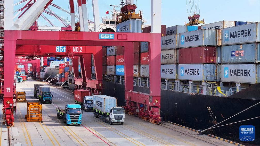 青岛港前湾港区,货运卡车在运送集装箱(无人机照片,10月29日摄)。新华社记者 李紫恒 摄