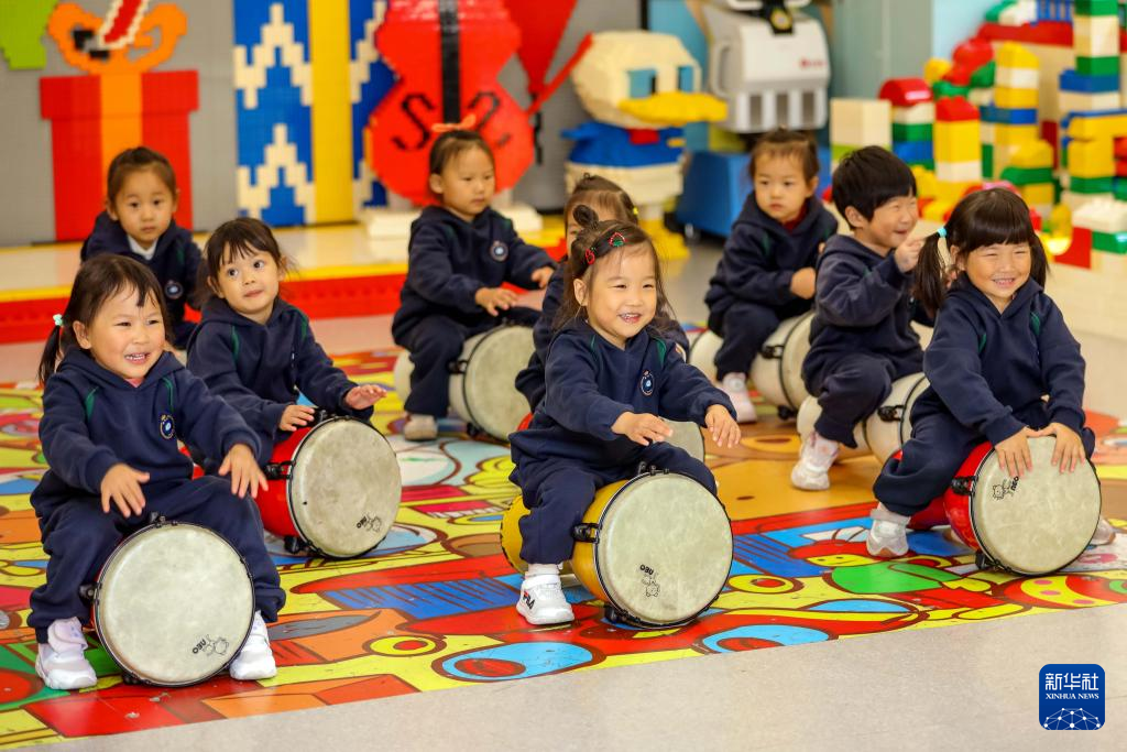 11月4日,在山东青岛恒星科技学院恒星托育中心,老师教托育班的小朋友学习非洲鼓。