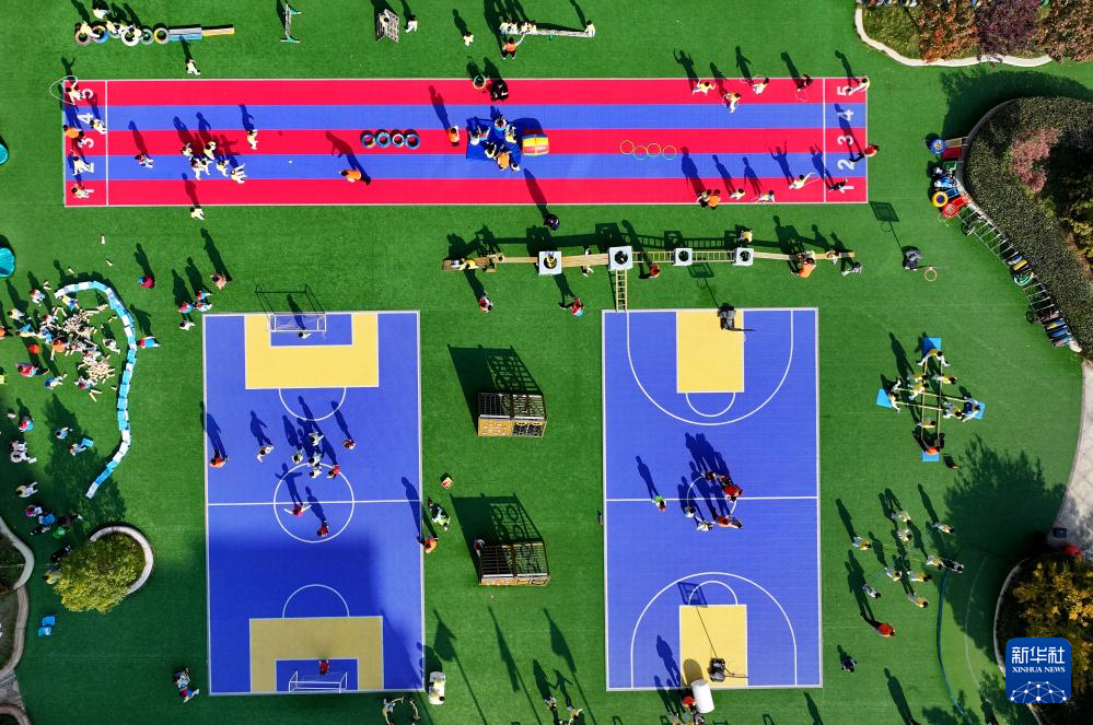 11月5日,在山东枣庄红黄蓝幼儿园,孩子们在老师的陪伴下开展户外活动(无人机照片)。