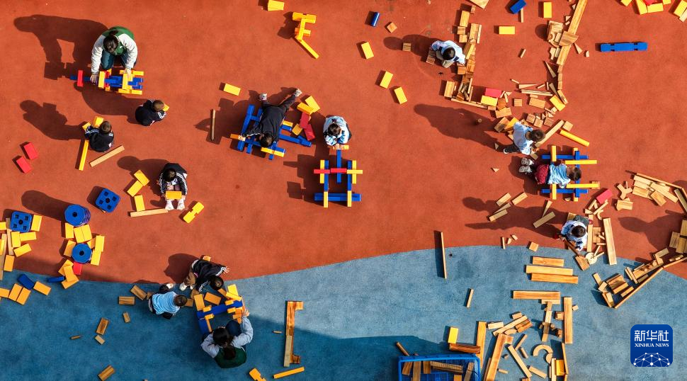11月4日,在山东省乐陵市天和嘉园幼儿园,老师陪托育班的孩子做游戏(无人机照片)。