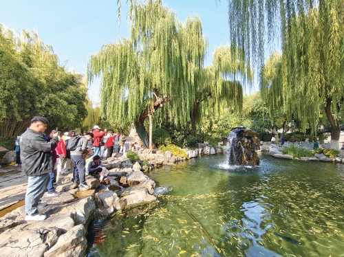 清澈的泉水自石间奔泻而下,在初冬的阳光下熠熠生辉,引得游人纷纷驻足,沉浸在这一灵动的水韵之中。