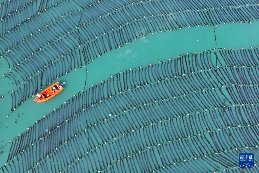 11月10日,在山东省荣成市桑沟湾海洋牧场,养殖工人在养殖区穿梭作业(无人机照片)。