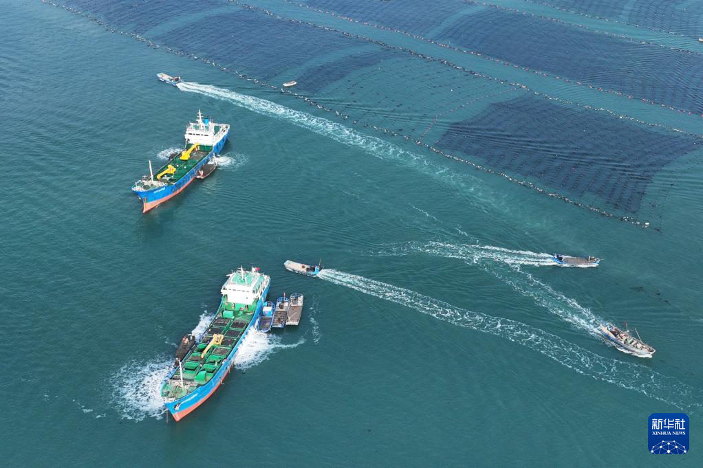 11月11日,在山东省荣成市爱伦湾海洋牧场,运鲜船在装运鲍鱼南下福建越冬(无人机照片)。
