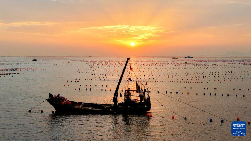 11月11日,在山东青岛西海岸新区海域,养殖户在收获牡蛎和扇贝(无人机照片)。