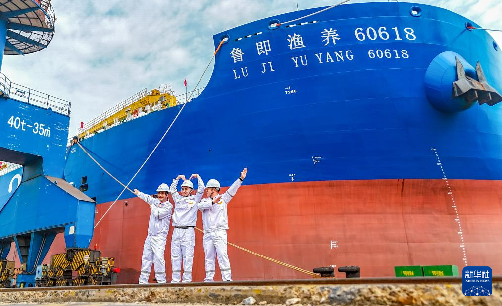 11月15日,由青岛国信集团投资建设的15万吨级智慧渔业养殖工船“国信1号2-2”在中国船舶集团青岛北海造船有限公司正式交付运营,命名为“鲁即渔养60618”。本次交付的养殖工船在投饲、取水等核心系统实现升级,将开展鲑鳟鱼工船全年连续养殖试验,构建从育苗到营销的全产业链模式。新华社发(张进刚摄)