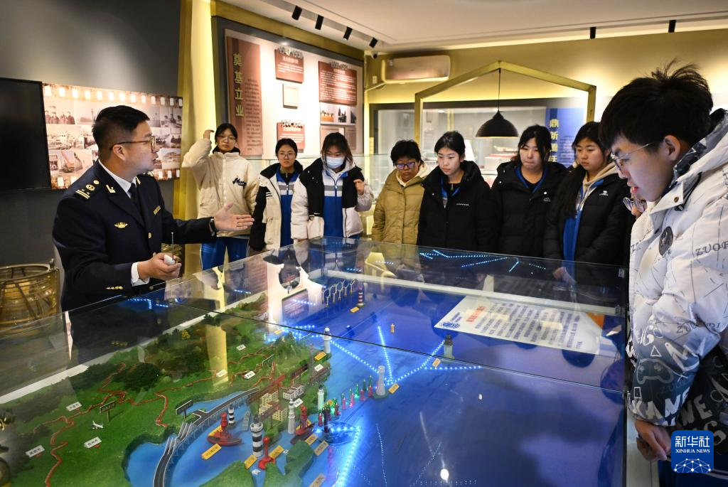 12月10日,青岛航标处工作人员在团岛灯塔博物馆内为学生讲解。新华社记者李紫恒摄