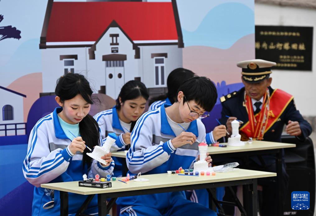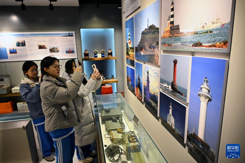 12月10日,学生代表在团岛灯塔博物馆内参观、拍摄。新华社记者李紫恒摄