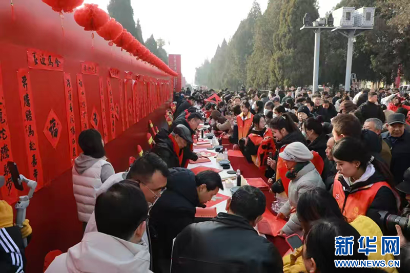 启动仪式现场,在曲阜万仞宫墙前广场,书法家挥毫泼墨,书写春联和“福”字。