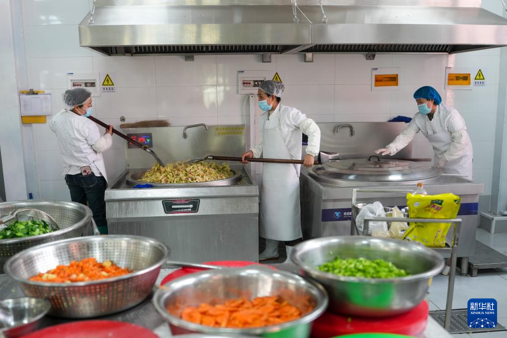 如今,学校建立了全流程管理制度,每个环节都有专人负责,工作人员也全部从学生家长中聘用。餐厅后厨清洗、消毒、烹饪设备一应俱全,“明厨亮灶”让食材处理、加工全过程透明可监督,保障滩区娃健康成长。新华社记者 朱峥 摄