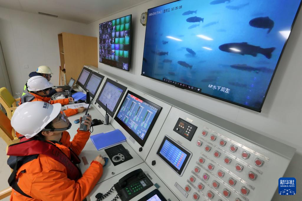 1月16日,在山东港口烟台港,工作人员在集控室指挥三文鱼鱼苗装舱作业。