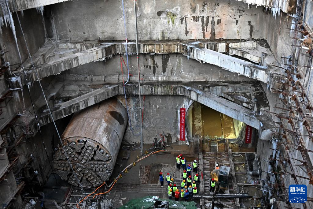 1月21日,建设者在青岛地铁5号线四方厂站接收井等待右线贯通。新华社记者 李紫恒 摄