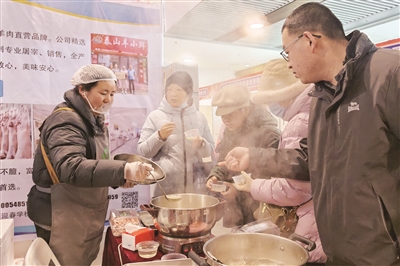 东平湖咸鸭蛋、肥城演马陈洪牛肉、宁阳汶鹤绿豆粉皮……大集开到“家门口”,市民不用去往县(市、区)也能品尝到地道风味。女儿茶、土鸡蛋、蜜三刀、桃酥等本地特产与年货糕点备受市民青睐。香气四溢的不止糕点。在“泰山羊小鲜”羊肉展位前,现煮的羊肉汤热气腾腾,吸引市民驻足品尝,新鲜羊肉的细腻口感赢得了大家的称赞,不少人当即挑选起来,准备买回家做一道暖身滋补菜。