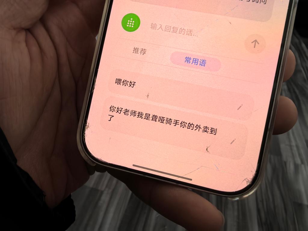 小伟的手机里存有几十条定制短语,简洁明了且覆盖取送餐全流程,“我听不到声音,我只能通过文字与你联系”“外卖已送到指定位置”……