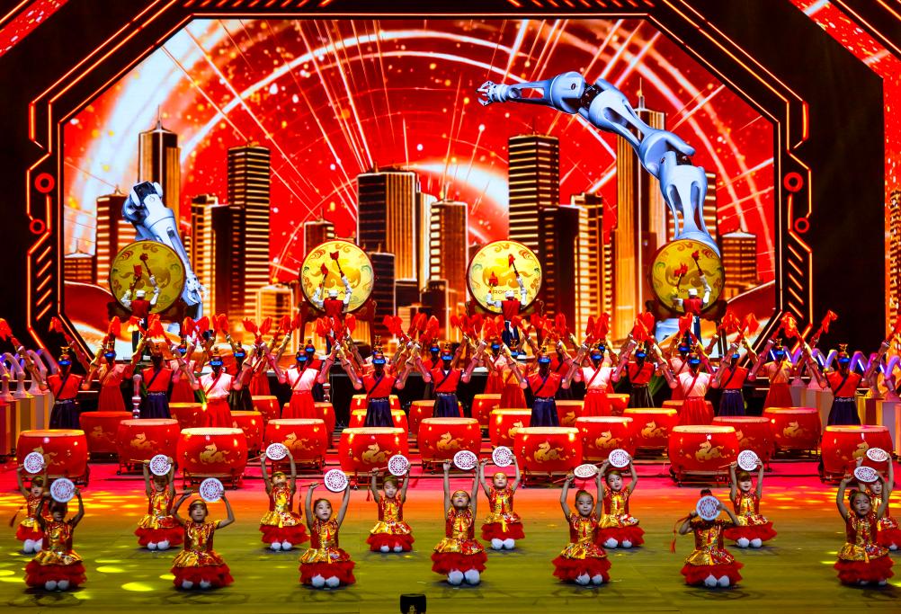 在晚会开场《万马奔腾》节目中,机器人在整齐有力地击鼓。(受访者供图)