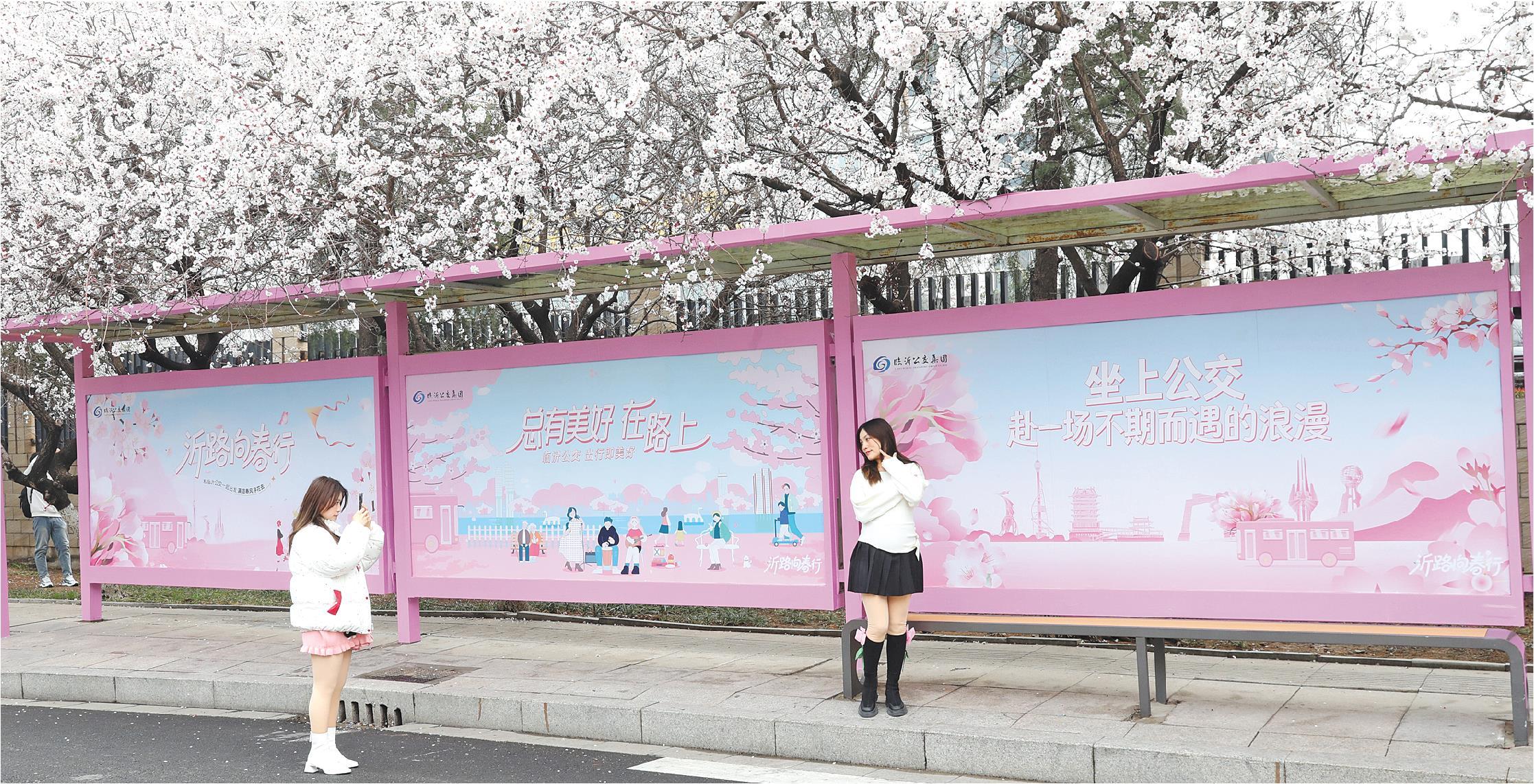 3月18日,山东临沂汶河路的公交站牌“焕新”,穿上了洋溢着春天气息的粉色“新衣”,配合着周围的粉白杏花,吸引众多市民前来拍照打卡,不少网友称该公交站为“临沂最美公交站”。